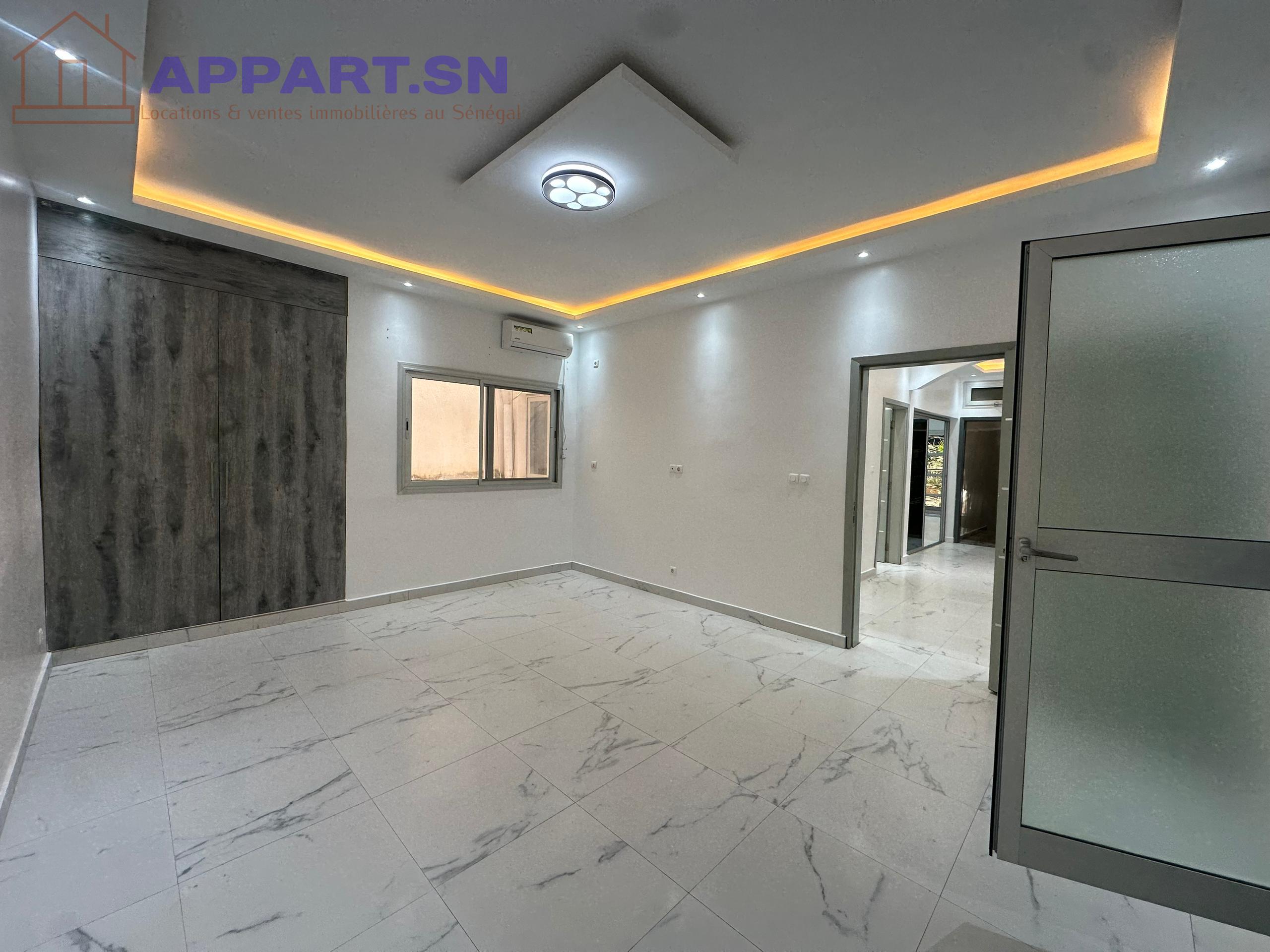 Appartement F4 entièrement climatisé à louer Ouakam Extension 1er étage il est composé de 3 chambres chacune avec sde 1 salon avec balcon 1 espace familial 1 cuisine avec placard 1 sde visiteurs gardiennage H24