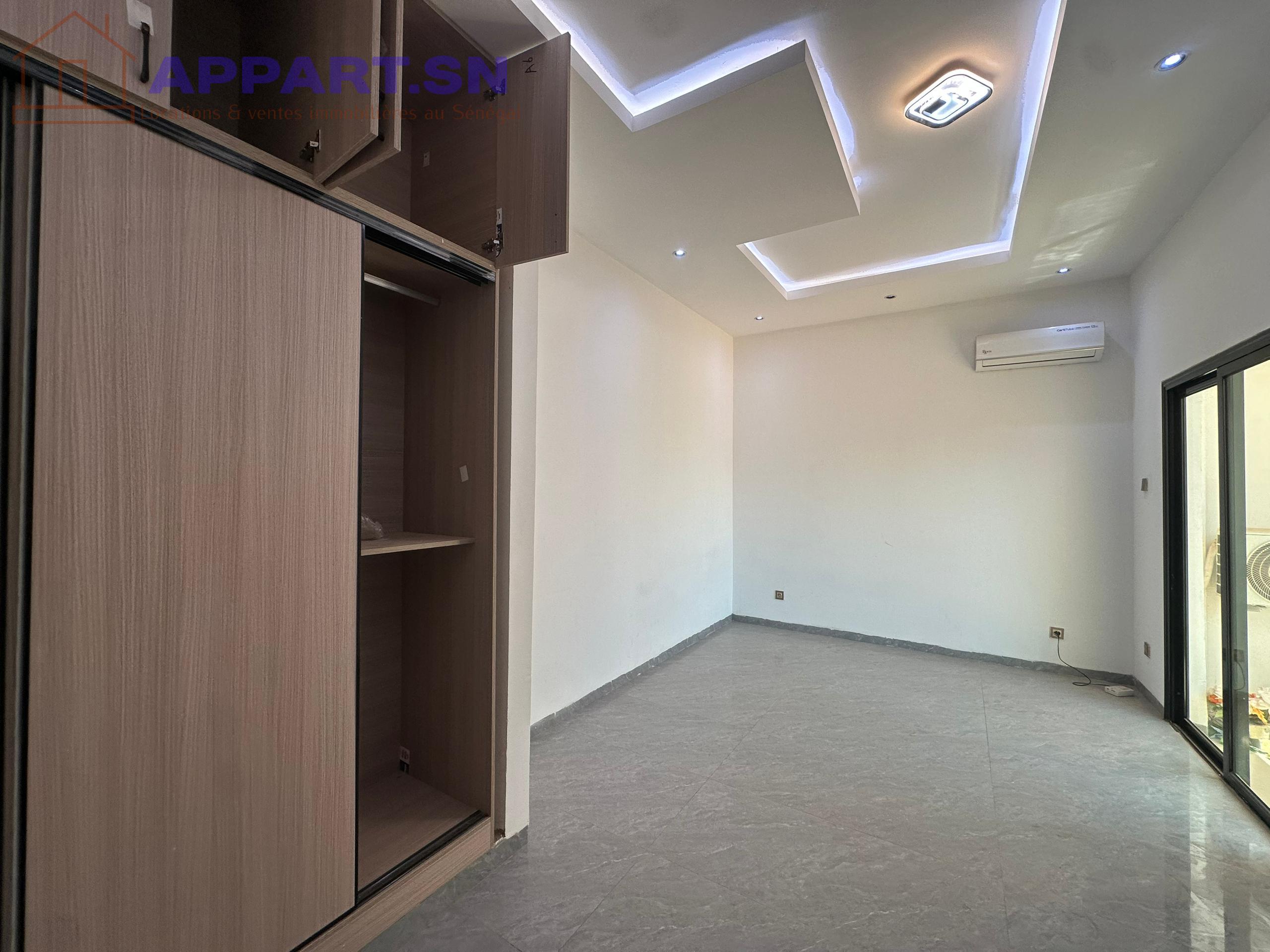 Appartement F3 entièrement climatisé au 1er étage à louer Ngor Almadies Zone de Recasement il est composé de 2 chambres chacune avec sde et rangement 1 entrée salon 1 cuisine entièrement équipée avec buanderie 1 sde visiteurs immeuble avec gardiennage H24